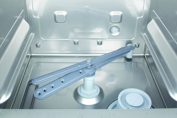 Bauweise: Vollständig einwandige Bauweise mit teilweise doppelwandiger Konstruktion der Waschkammerseiten. Doppelwandiger Aufbau der Tür. Der geschweißte Spülkammerboden ist mit einem vollfläckigen, integrierten Oberflächenfilter ausgestattet, der dank seiner Größe und Geometrie im Arbeitsalltag nicht verstopfen kann. Die tiefgezogene Spülkorbführungen sind abgerundet. Der Spülraum ist frei von Versorgungsleitungen und scharfen Kanten.