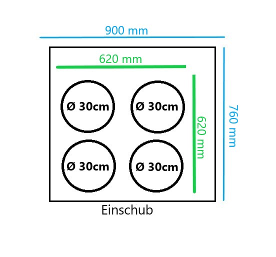 Für 4 Pizzen (pro Kammer) je Ø 300 mm oder 1 Pizza Ø 500mm oder 1 Blech 400x600mm