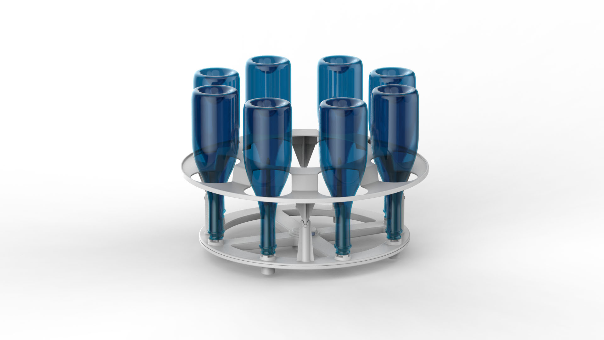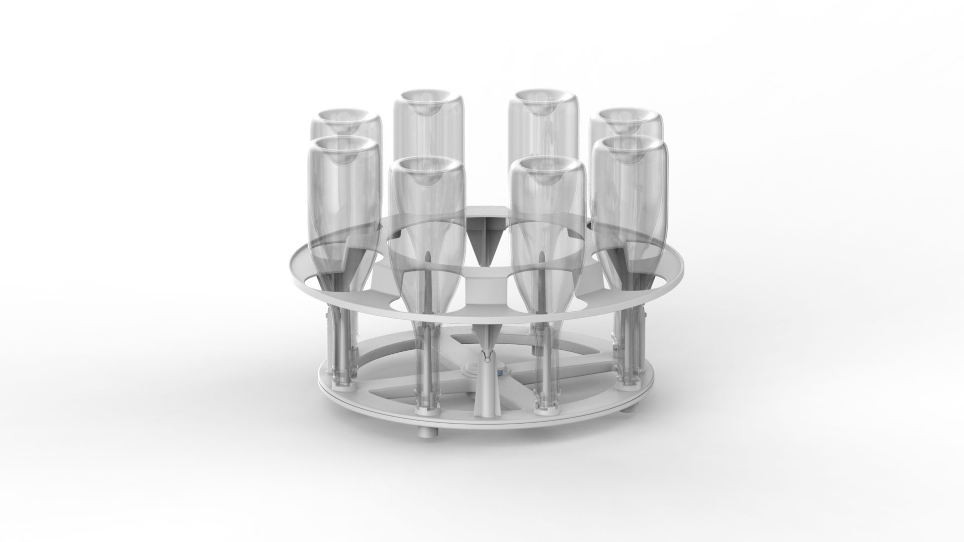 Innovatives Flaschenspülsystem für bis zu 8 Flaschen mit einem Durchmesser von max. 115mm und einer Höhe von max. 350mm