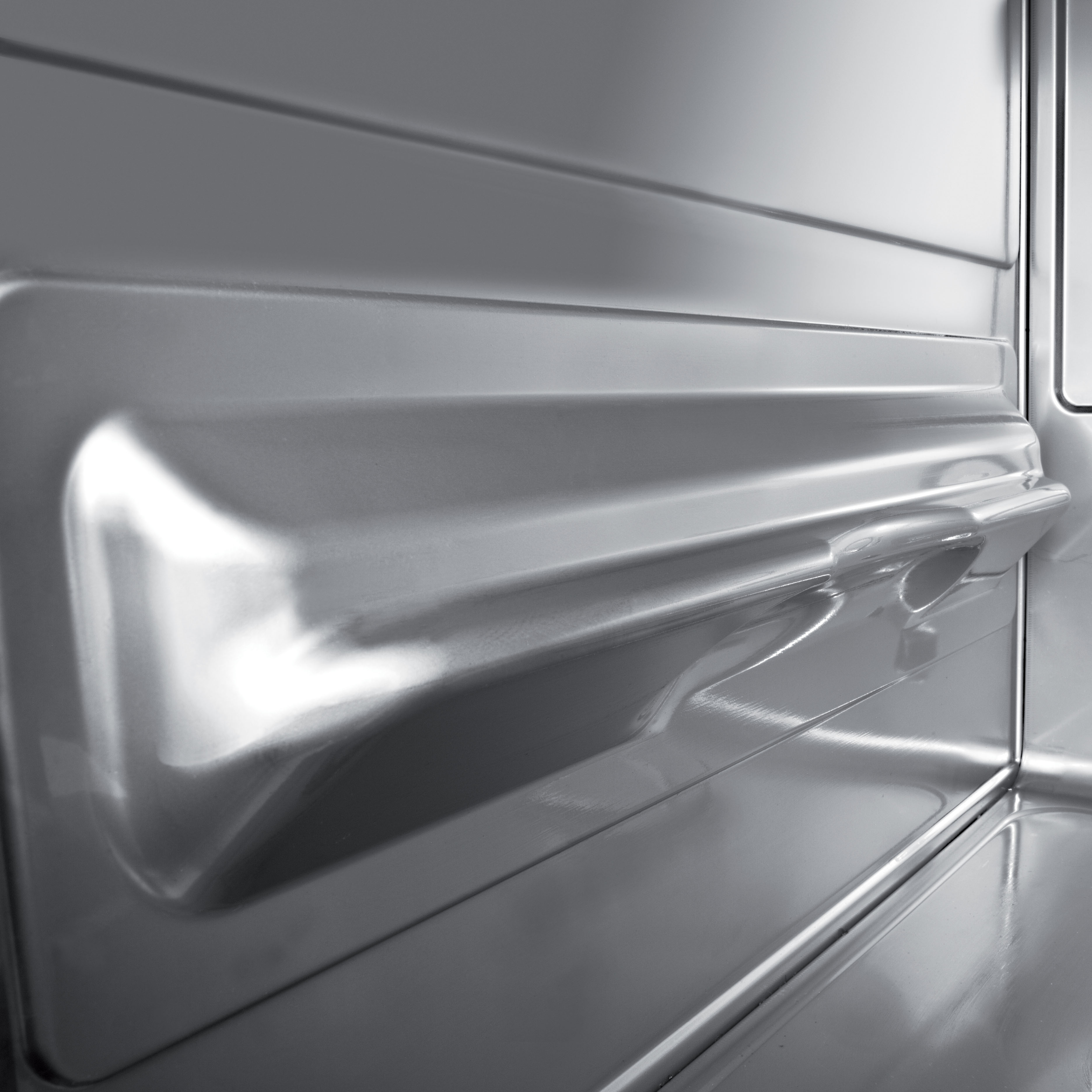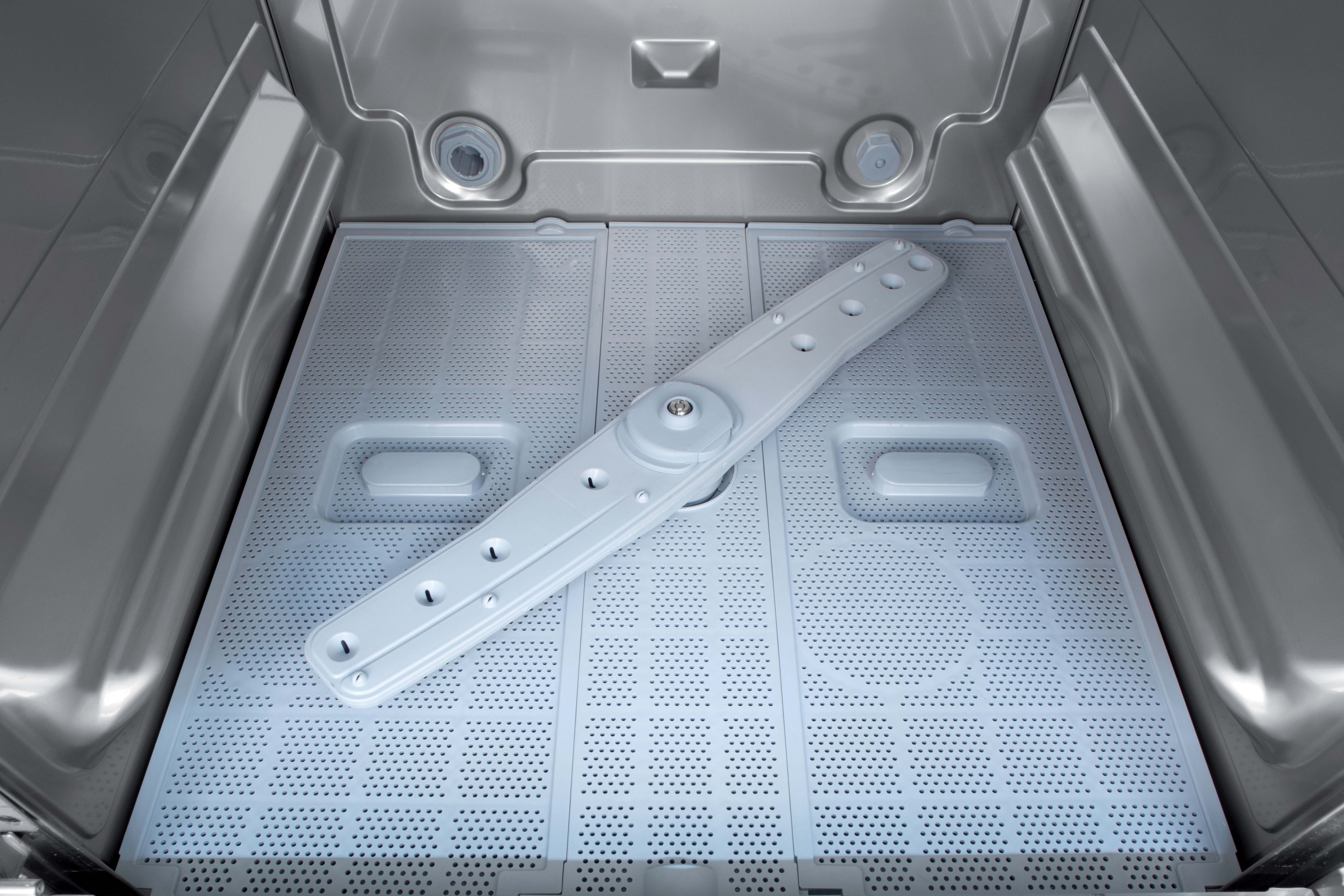 Die IsyTech 36-11 GD verfügt über ein Gehäuse aus Edelstahl (CrNi 18/10), dass auf Höhe der Spülkammer durch eine 2. Edelstahlwand verklebt ist. Das trägt zusätzlich zur Geräuschminimierung bei und schützt vor Wärme-Dispersion. Der Innenraum der Maschine ist Tiefgezogen und in den Seitenwänden ist die Korbauflage bereits integriert. Zusätzlich ist der Innenraum frei von Rohren und Kanten, sodass eine Kompromisslose Hygiene gewährt wird. Der Spültank ist vollflächig oberhalb der Spüllauge durch ein dreigeteiltes Flächensieb aus Verbundmaterial abgedeckt. Vor dem Pumpenzulauf befindet sich zusätzlich ein weiterer Filter für eine kontinuierliche Aufbereitung des Spülwassers. Die Türe der Maschine ist vollständig doppelwandig isoliert und ist durch zwei Scharniere mit dem Gehäuse verbunden. Die Rückwand besteht aus beschichtetem Stahl und schützt damit vor Schmutz, der in die Maschine eindringen könnte.