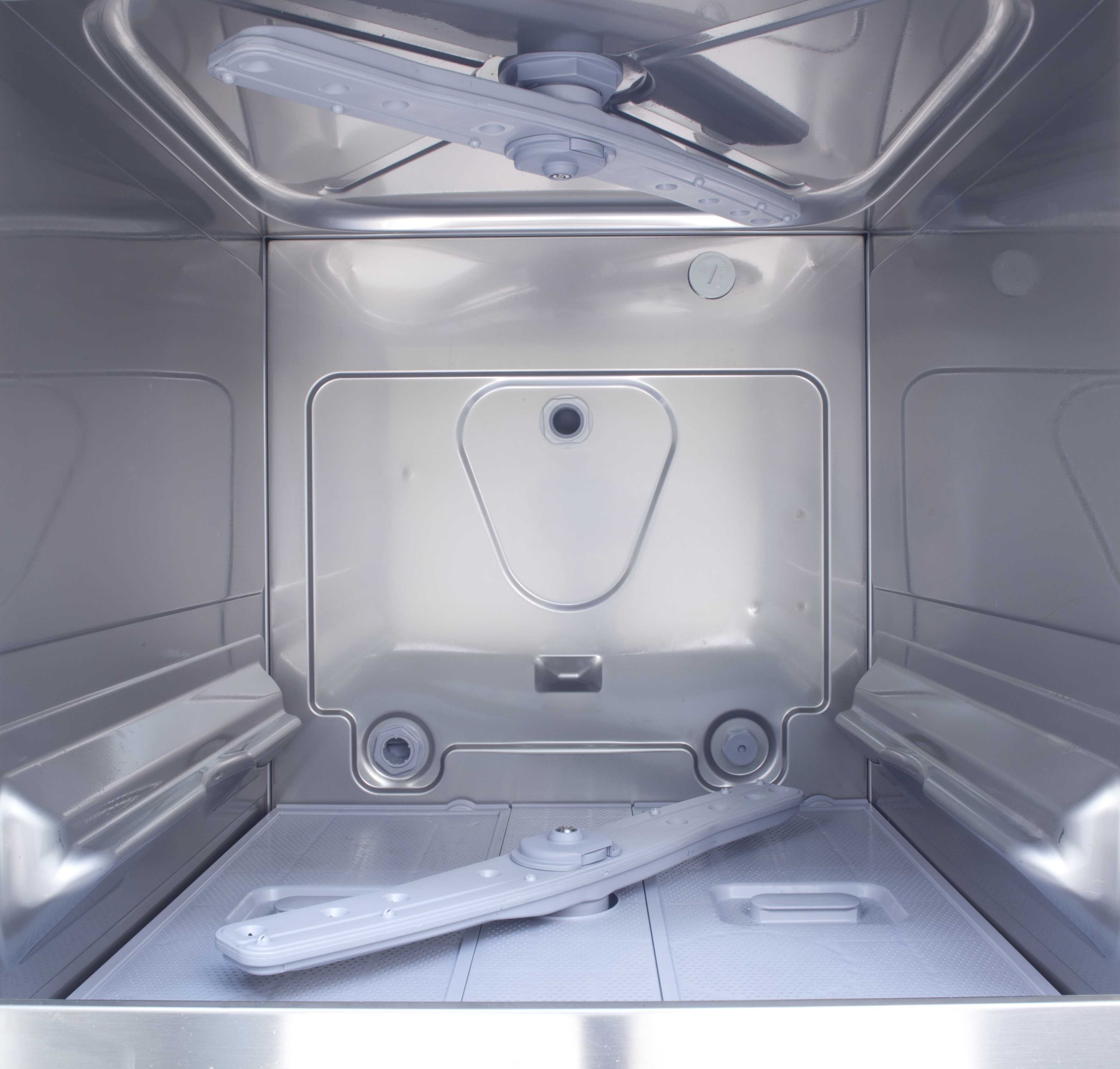 Die IsyTech 34-11 GD verfügt über ein Gehäuse aus Edelstahl (CrNi 18/10), dass auf Höhe der Spülkammer durch eine 2. Edelstahlwand verklebt ist. Das trägt zusätzlich zur Geräuschminimierung bei und schützt vor Wärme-Dispersion. Der Innenraum der Maschine ist Tiefgezogen und in den Seitenwänden ist die Korbauflage bereits integriert. Zusätzlich ist der Innenraum frei von Rohren und Kanten, sodass eine Kompromisslose Hygiene gewährt wird. Der Spültank ist vollflächig oberhalb der Spüllauge durch ein dreigeteiltes Flächensieb aus Verbundmaterial abgedeckt. Vor dem Pumpenzulauf befindet sich zusätzlich ein weiterer Filter für eine kontinuierliche Aufbereitung des Spülwassers. Die Türe der Maschine ist vollständig doppelwandig isoliert und ist durch zwei Scharniere mit dem Gehäuse verbunden. Die Rückwand besteht aus beschichtetem Stahl und schützt damit vor Schmutz, der in die Maschine eindringen könnte.