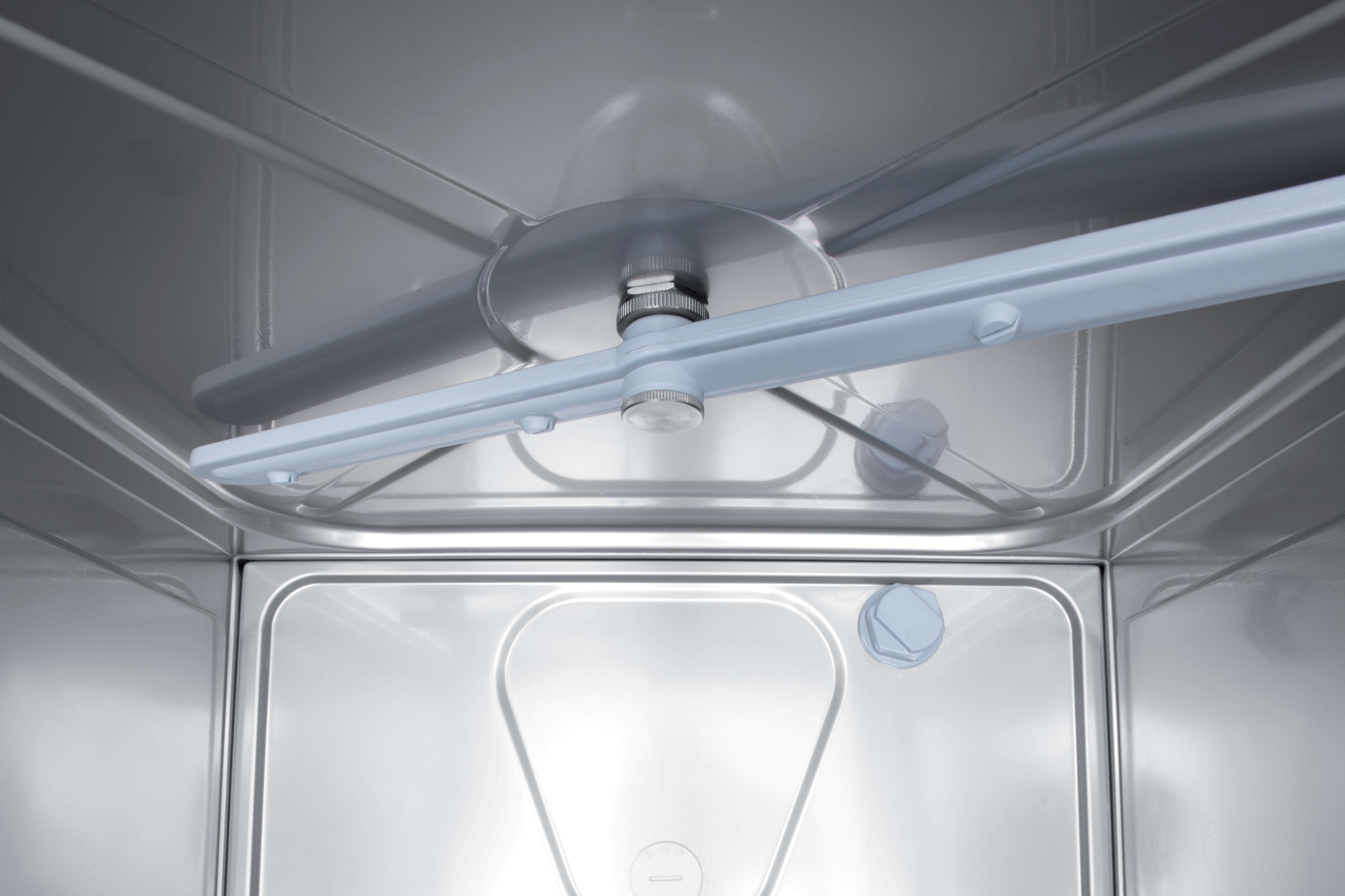 Bauweise: Vollständig einwandige Bauweise mit teilweise doppelwandiger Konstruktion der Waschkammerseiten. Doppelwandiger Aufbau der Tür. Der geschweißte Spülkammerboden ist mit einem vollfläckigen, integrierten Oberflächenfilter ausgestattet, der dank seiner Größe und Geometrie im Arbeitsalltag nicht verstopfen kann. Die tiefgezogene Spülkorbführungen sind abgerundet. Der Spülraum ist frei von Versorgungsleitungen und scharfen Kanten.